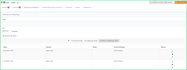 Die Vermerke werden von neusten zum ältesten sortiert. Rechts in der Tabelle finden Sie folgende Aktionen: