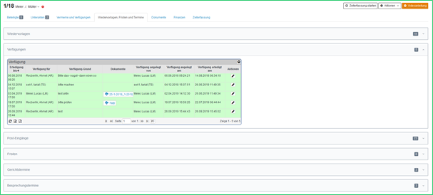 In diesem Reiter erhalten Sie einen Überblick über alle Wiedervorlagen, Verfügungen, Posteingänge, Fristen, Gerichts- und Besprechungstermine der Akte. Die einzelnen Abschnitte können Sie aufklappen, in dem Sie darauf klicken. Es erscheint eine Tabelle mit den Einträgen. Die Einträge sind farblich markiert: gelb für anstehend, grün für erledigt und rot für versäumt.