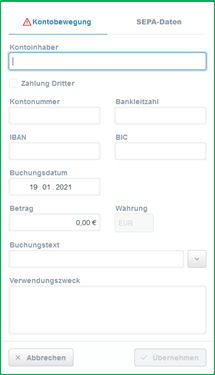 Nehmen wir als Beispiel eine Zahlung vom Mandanten: Unter „Kontoinhaber“ tragen Sie den Namen des Mandanten ein. Als Betrag geben Sie den Betrag der Zahlung ein. Als Buchungstext wählen Sie „Zahlung Mandant“ aus. Unter „Verwendungszweck“ können Sie die Aktennummer oder die Rechnungsnummer eintragen. Nachdem Sie diese Daten eingetragen haben, klicken Sie auf „Übernehmen“.