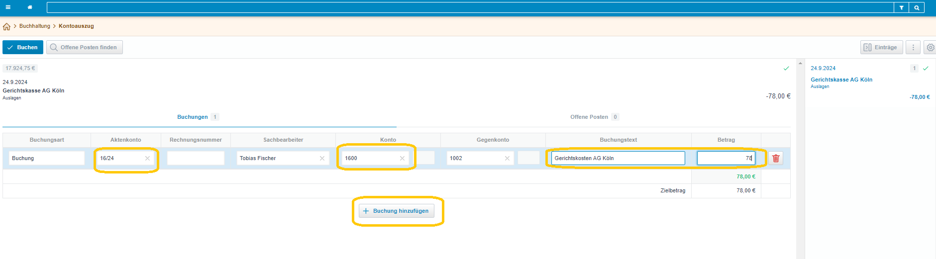 Dann eine Buchungszeile erstellen und dort die Akte und Auslagenkonto 1600 auswählen, in die die Auslagen gebucht werden sollen. Dann noch Buchungstext und Betrag eingeben: