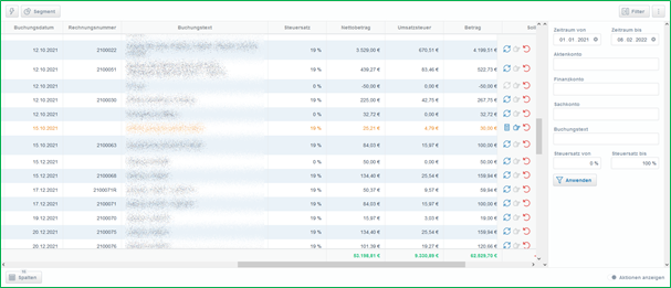 Oben links über der Tabelle finden Sie zwei Button. Erstens ein Blitz-Symbol. Hiermit haben Sie eine Schnell-Auswahl für den Zeitraum. Der zweite Button hat die Beschriftung „Segmente“. Damit können Sie die Einträge nach Segmenten sortieren. Wählen Sie bspw. Akten aus, werden die Buchungen der Akte entsprechend zusammengefasst.