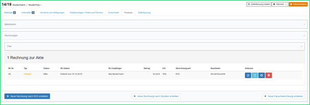 Um eine RVG-Rechnung zu erstellen, öffnen Sie die Akte, gehen Sie in den Reiter „Finanzen“ und klicken Sie auf „Neue Rechnung nach RVG erstellen“. Das Formular wird in einem Reiter des Browsers geöffnet.