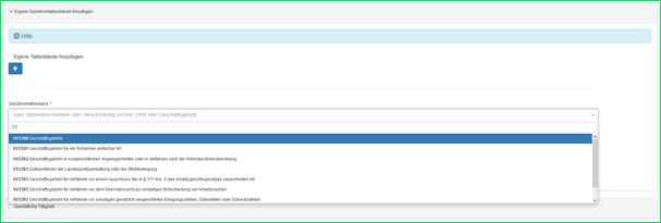 Dann haben Sie auch noch die Möglichkeit, eigene Gebührentatbestände hinzuzufügen. Dafür setzen Sie das Häkchen bei „Eigene Gebührentatbestände hinzufügen“. Es erscheint ein Fenster, in dem Sie auf das Plus-Symbol klicken müssen. Jedes Mal, wenn Sie auf das Plus klicken, erscheint ein Feld, in dem Sie nach der Gebühr suchen. Sie können hierfür die Nummer oder den Namen der Gebühr verwenden. Klicken Sie auf die passende Gebühr, um es auszuwählen.