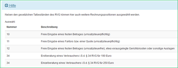 Unter „Hilfe“ finden Sie eine Reihe von Nummern, wie etwa 10 und 11, mit denen Sie Gebühren selbst definieren können.