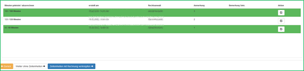 Wenn Sie Zeiteinheiten abrechnen wollen, finden in diesem Reiter alle nicht abgerechnet Zeiteinheiten. Die Zeiteinheiten sind bereits grün hinterlegt, was bedeutet, dass die Zeiteinheit zur Abrechnung ausgewählt wurde. Wenn Sie eine Zeiteinheit anklicken, wird es weiß und ist damit für die Abrechnung abgewählt. Zum Abschluss klicken Sie unten auf „Zeiteinheit mit Rechnung verknüpfen“.