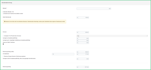 Sollten in der Akte mehr als ein Benutzer-Stundensatz abgerechnet werden, dürfen auch nur diese Stundensätze in der Akte (in den Akten-Stammdaten) hinterlegt sein. Andernfalls gibt es einen Anzeigefehler in der PDF-Rechnung. Dann muss die Rechnung storniert und neu erstellt werden. Tipp: Erstellen Sie die Rechnung immer erst als Entwurf und prüfen das PDF.