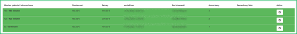Die Summe der Zeiten wird in Minuten unter der Tabelle dargestellt. Dieser wird mit dem Stundensatz der Akte multipliziert, um das Honorar zu berechnen.