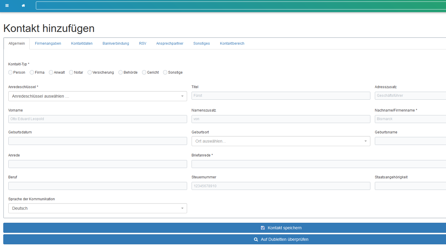 Um einen Kontakt anzulegen, gehen Sie im Menü unter „Kontakte“ auf „Kontakte hinzufügen“. Es öffnet sich das Formular zum Anlegen eines Kontakts. Es reichen schon drei Angaben, um einen Kontakt anzulegen: Kontakt-Typ, Anrede (soweit der Kontakt-Typ eine natürliche Person darstellt) und Nachname (Firmenname). Jedoch haben Sie viele weitere Reiter, um den Kontakt zu ergänzen.