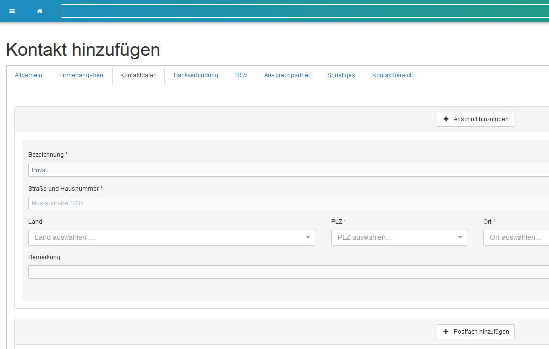 Wollen Sie beispielsweise die Anschrift hinzufügen, dann gehen Sie in den Reiter „Kontaktdaten“, klicken Sie dann auf „+ Anschrift“. Es erscheint ein Formular, wo Sie die Adresse eintragen können. Jedem Kontakt können mehrere Anschriften hinzugefügt werden.