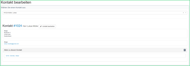 Um einen Kontakt zu ergänzen oder zu bearbeiten, öffnen Sie im Menü „Kontakte“ > „Kontakte bearbeiten“. Suchen Sie nach dem Kontakt, den Sie bearbeiten wollen, in dem Sie in das Eingabefeld bspw. den Namen eintragen oder die Kontaktnummer mit vorangestellten #-Zeichen. Es werden Ihnen zunächst übereinstimmende Kontakte angezeigt. Mit einem Klick wählen Sie den Kontakt aus, den Sie bearbeiten wollen. Dieser wird dann unten angezeigt. Klicken Sie neben dem Namen auf „Kontakt bearbeiten“. Es erscheint ein Fenster, wo Sie Angaben ergänzen und speichern können.
