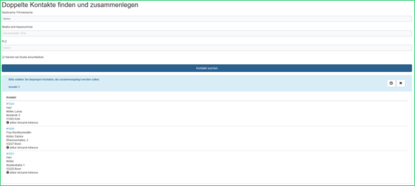 Diese erscheinen nun unter der Überschrift „Auswahl“. Nun müssen Sie mit einem Klick den Hauptkontakt markieren, in die Angaben aus beiden Kontakten zusammengefasst werden. Der andere Kontakt wird nicht gelöscht, sondern auf „inaktiv“ gestellt. Das bedeutet, dass der Kontakt wieder aktiviert und genutzt werden kann.