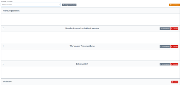 Unter „Meine Akten“ finden Sie Ihre individuellen Aktenstapel. Die existierenden Kategorien können Sie umbenennen oder löschen. Dafür finden Sie bei jeder Kategorie die entsprechenden Buttons. Sie können auch weitere Kategorien hinzufügen, den Button dafür finden Sie oben.