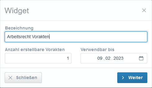 Öffnen Sie "Menü" > "Akten" > "Vorakten-Klickstrecke". Um eine Klickstrecke anzulegen, klicken Sie oben rechts auf "Widget". Es erscheint ein Fenster, in das Sie den Namen, die Anzahl der erstellbaren Akten und die Dauer der Gültigkeit eintragen. Nachdem Sie die Daten eingetragen haben, klicken Sie auf "Weiter". Damit wird die Klickstrecke gespeichert. Gleichzeitig erscheint im Fenster die Web-Adresse der Klickstrecke. Sie können diese Adresse kopieren und an den Mandanten schicken.