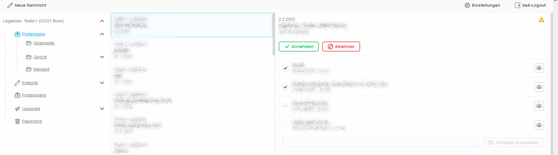 In der zweiten Spalte finden Sie die Nachrichten des Ordners. Klicken Sie auf eine Nachricht, erscheint es in der dritten Spalte. Hier können Sie die Nachricht Annehmen oder Ablehnen. Haben Sie eine Nachricht angenommen oder abgelehnt, können die Nachricht in einen anderen Ordner bewegen oder die Nachricht löschen. Unten bei den Anhängen tragen Sie in das Suchfeld die Akte (Nummer oder Bezeichnung) ein und klicken Sie dann auf "Anhänge importieren".