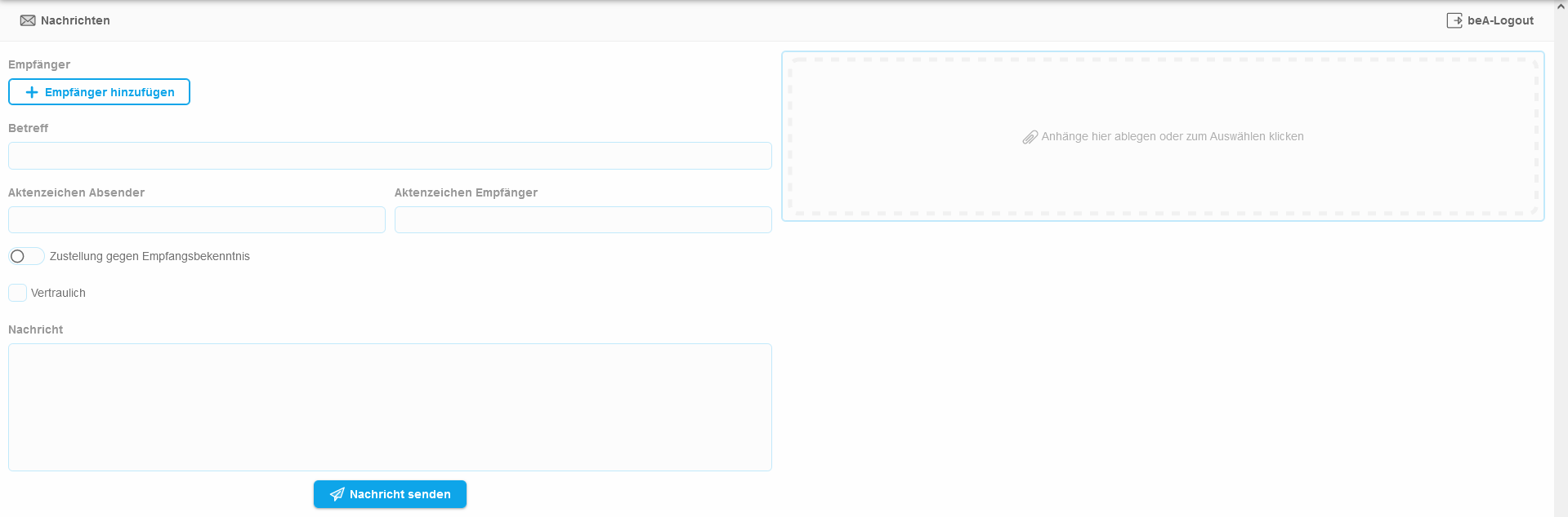 Nachdem Sie sich angemeldet haben, können Sie auch beA-Nachrichten aus Legalvisio verschicken. Es ist aufgebaut, wie Sie es etwa von E-Mail-Programmen kennen.