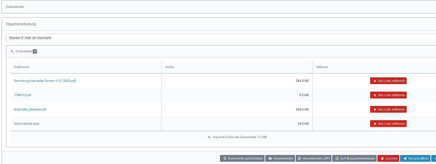 In der Stapelverarbeitung können Dokumenten-Aktionen nun über mehrere DOkumente gleichzeitig ausgeführt werden, wie etwa das Löschen, Versenden, Runterladen: