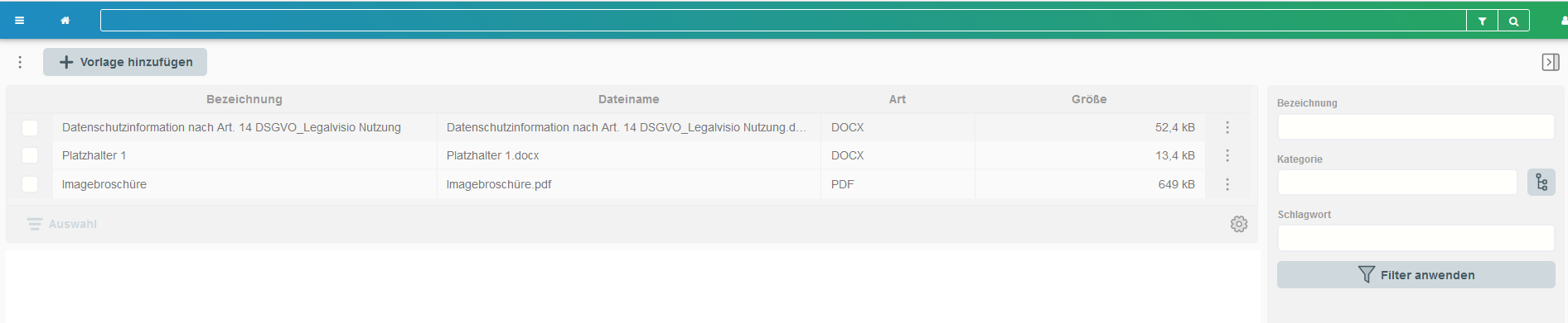Die hinterlegten Vorlagen können dann gesammelt ausgewählt werden und über das Auswahl-Menü unten links "Dokumente ausfüllen" mit einer Akte befüllt werden und runter geladen werden.