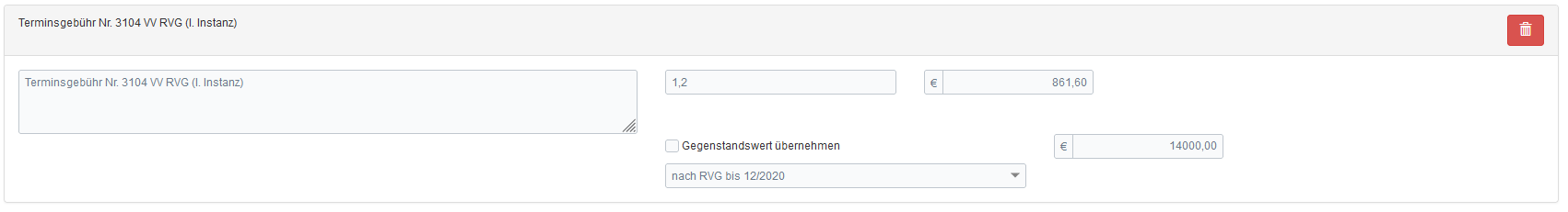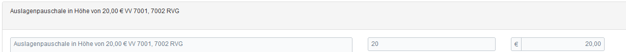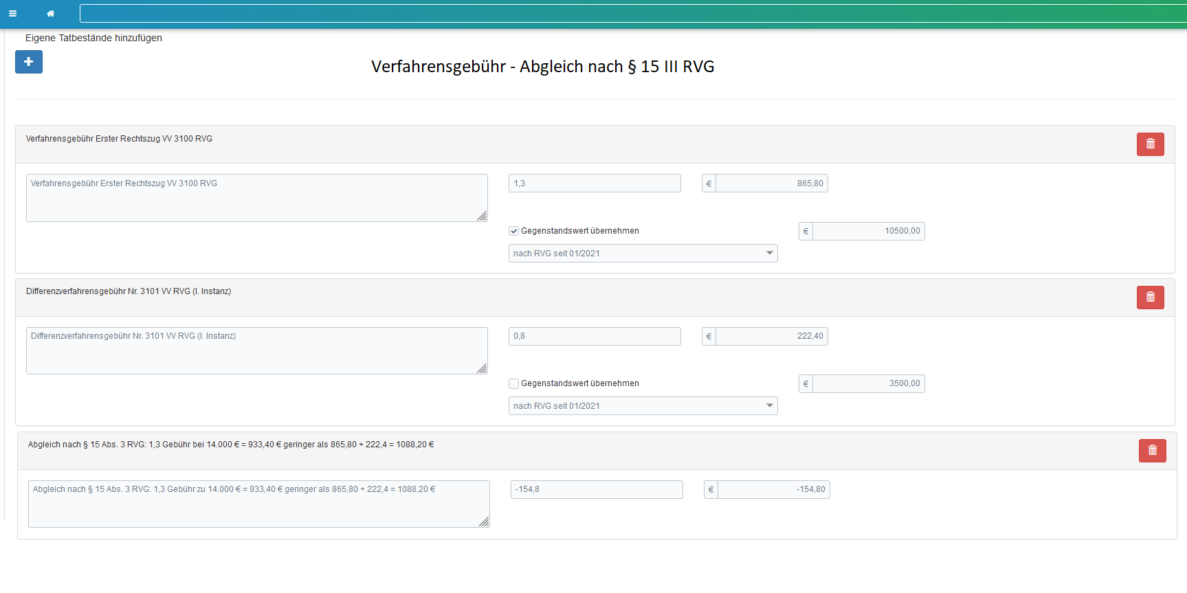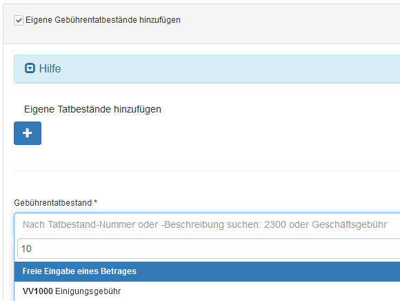 Dies kann im RVG-Rechner über die "Eigenen Gebührentatbestände" erfolgen.