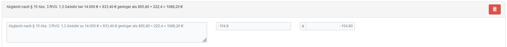 Im Textfeld kann man dann den Abgleichtext eintragen, sowie den Betrag, den man abziehen möchte, wenn der Vergleich des Gesamtwertes geringer ausfällt, als die Summe der Differenzverfahrensgebühren. Für ein Abziehen einfach ein Minus vor die Zahl im mittleren Feld setzen: