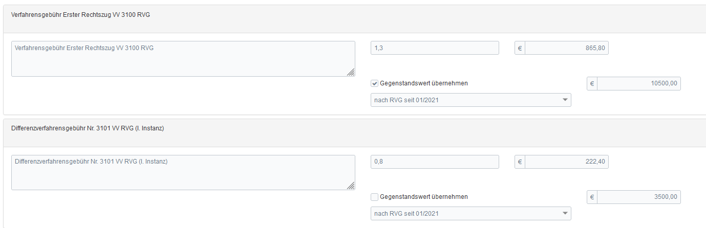 Bei der Differenzverfahrensgebühr dann darauf achten, dass ein anderer Gegenstandswert eingetragen wird und die Checkbox davor deaktiviert ist.