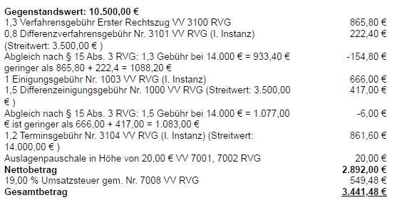 Das gleiche macht man für die Einigungsgebühren. Auch hier wieder den Abgleich mit der Nr. 10:
