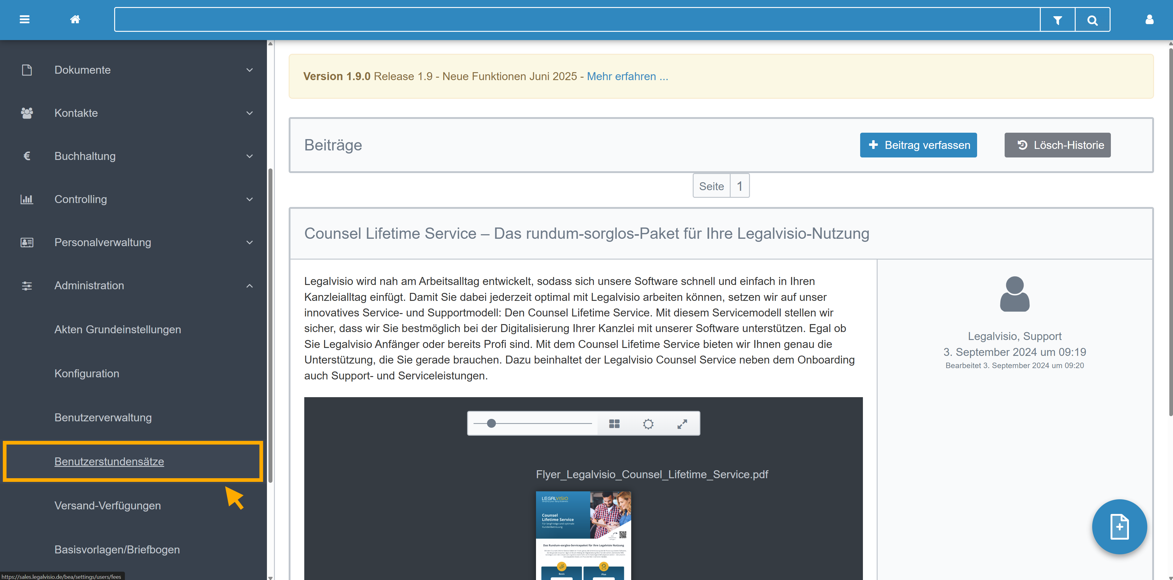 - Wählen Sie im Burgermenü den letzten Punkt Administration > Benutzerstundensätze aus.