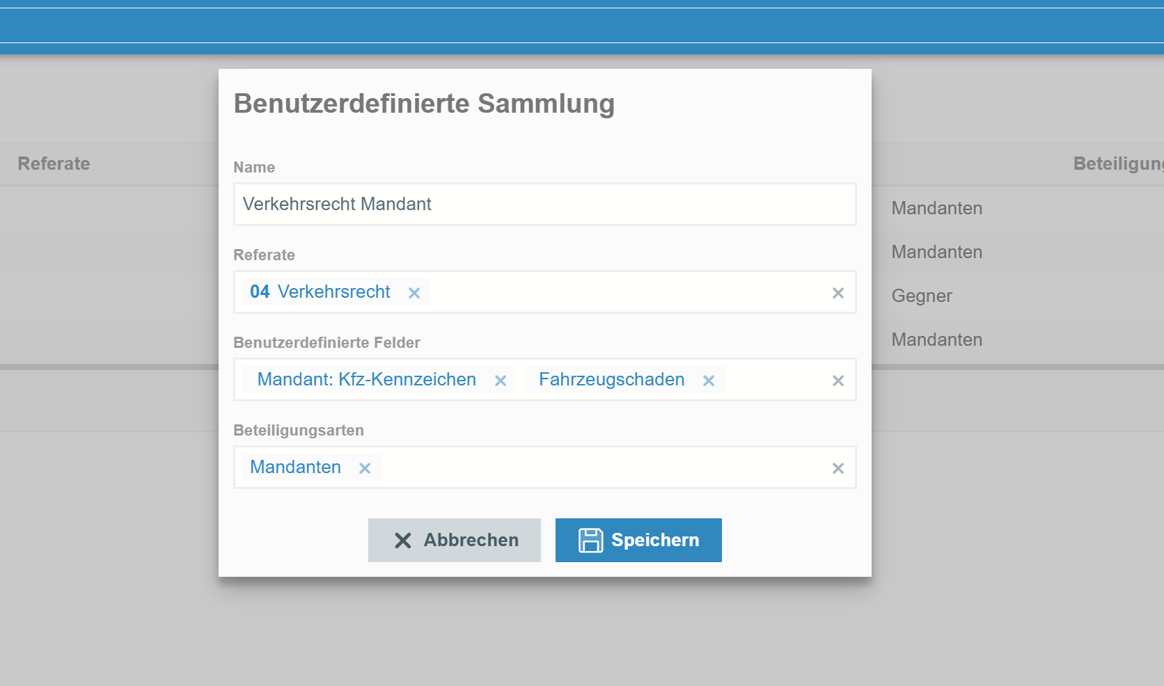 Mithilfe der Feldsammlungen in Legalvisio können Sie definieren, welche benutzerdefinierten Felder bei der Aktenanlage, bei Auswahl eines Referates, nach Ergänzung eines Beteiligten direkt im Beteiligten auszufüllen sind.