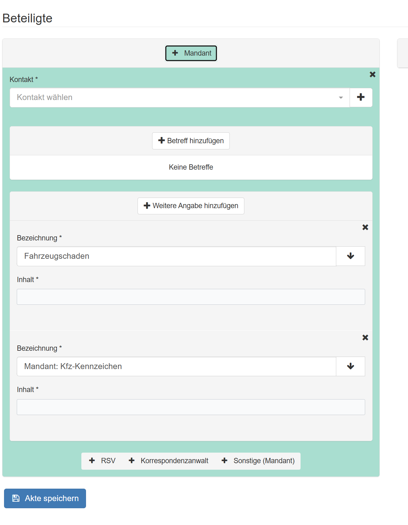In unserem Beispiel habe ich also nur eine neue Akte angelegt, das Referat "Verkehrsrecht" ausgewählt und auf das "+" beim Mandanten geklickt, um den Beteiligten hinzuzufügen. Ganz automatisch kamen dann schon unsere benutzerdefinierten Felder für den Fahrzeugschaden, sowie das KFZ-Kennzeichen.