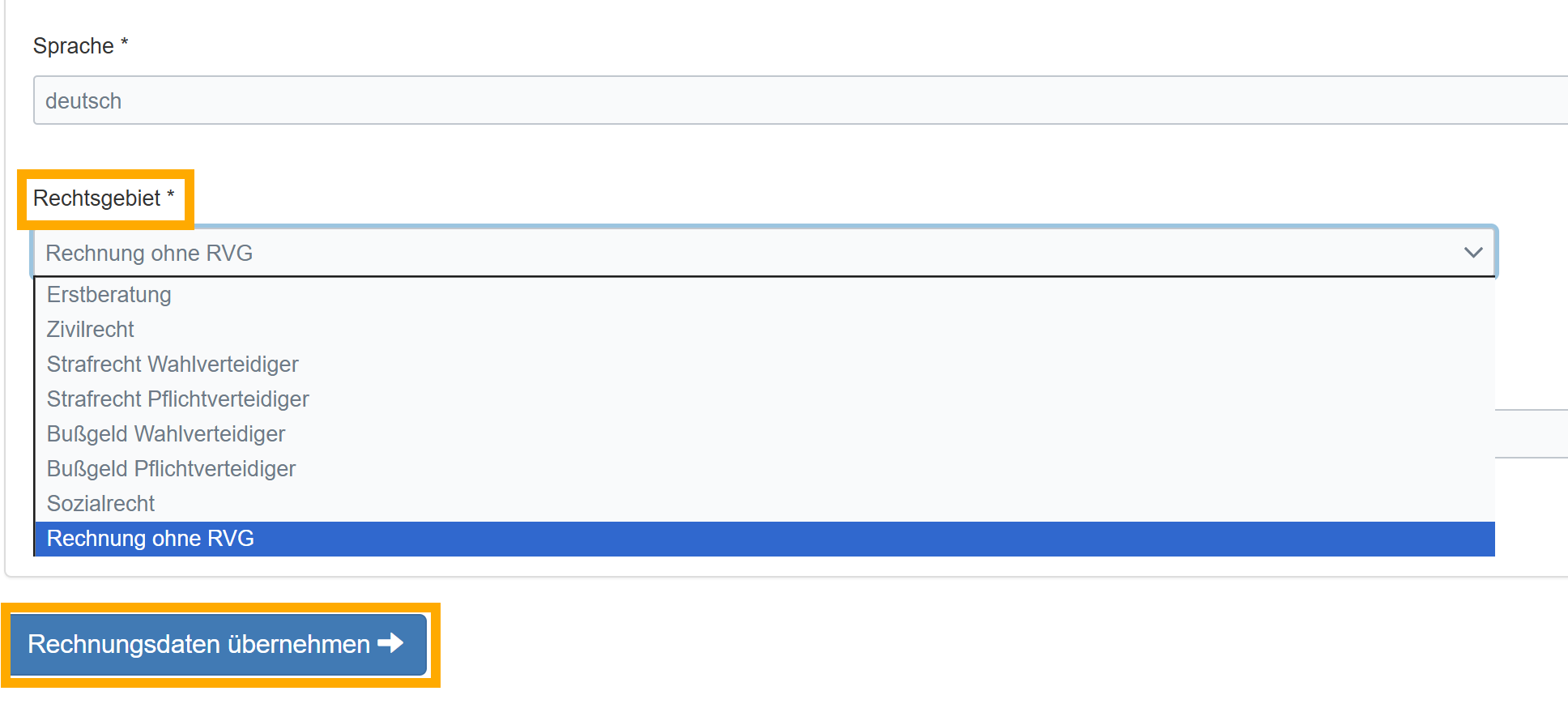 2. Beim Rechtsgebiet öffnen Sie das Drop-Down-Menü und wählen "Rechnung ohne RVG" aus.