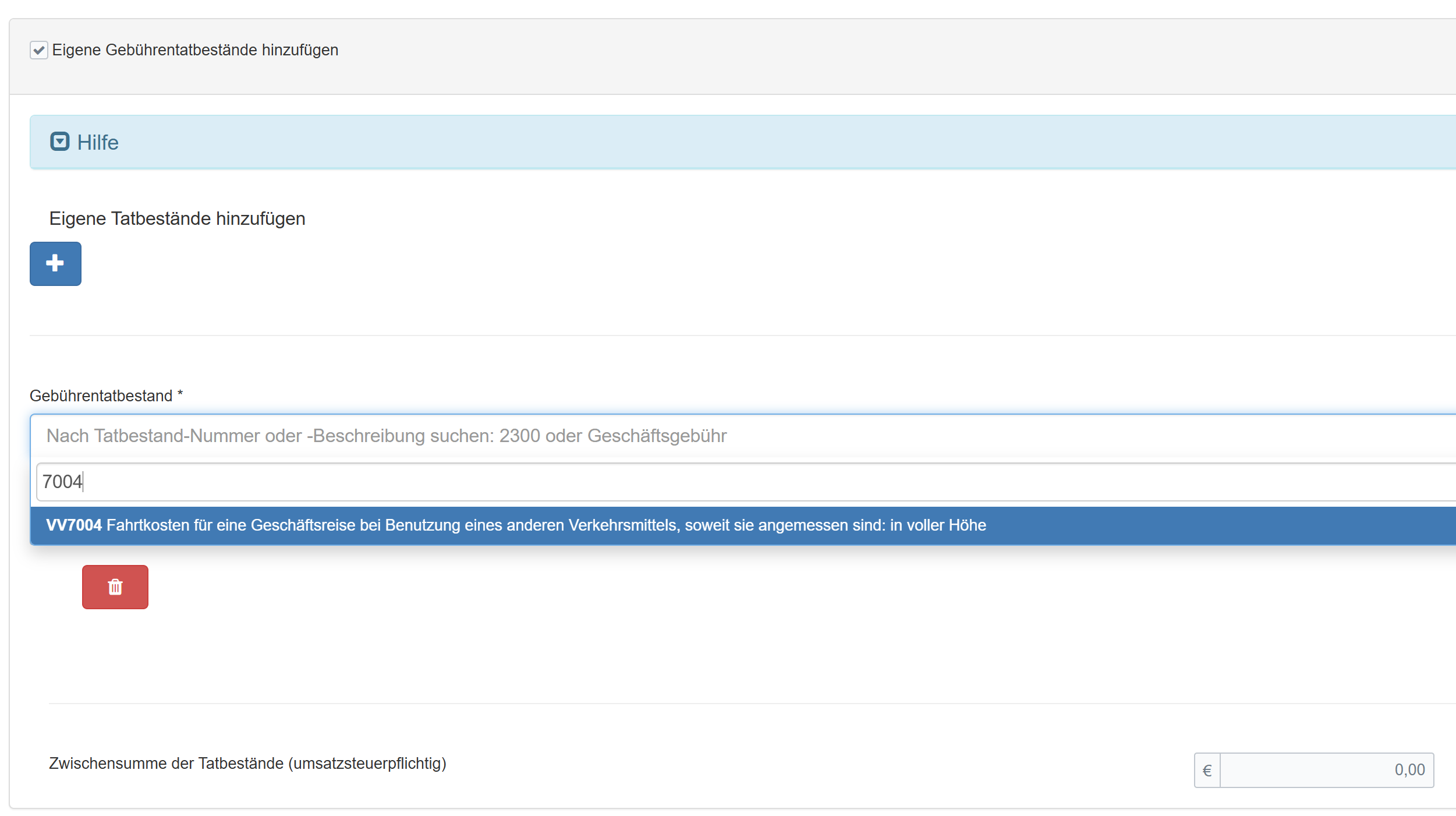 Hinweis: An diesem Punkt der Rechnungsstellung kann weiter unten auch die Umsatzsteuer manuell auf "0 %" gesetzt werden. Den entsprechenden Hinweis ergänzen Sie über die eigenen Gebührentatbestände mit der Eingabe der Nr. 13 als Textfeld.