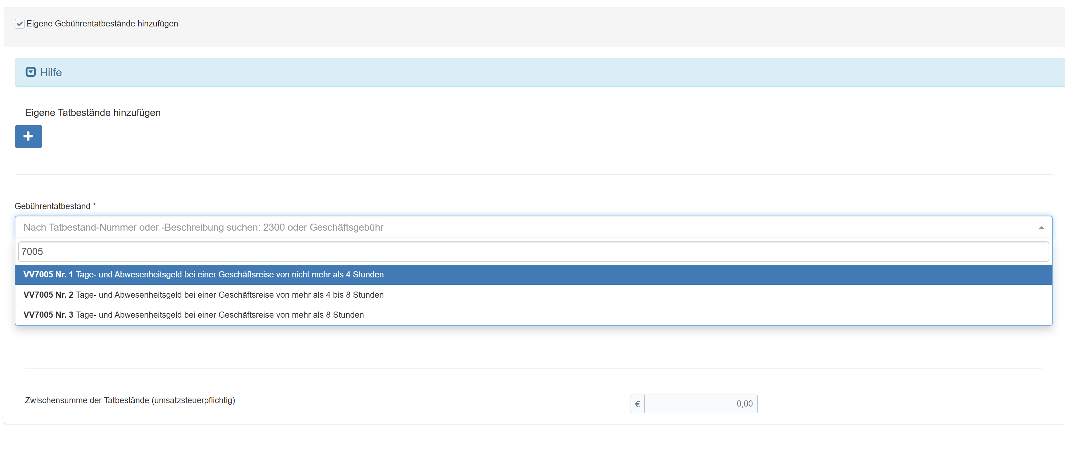 Bei manchen Gebühren gibt es mehrere Auswahlmöglichkeiten, wie z.B. beim Tage- bzw. Abwesenheitsgeld. Hier unterscheiden wir nach der Menge der Stunden.